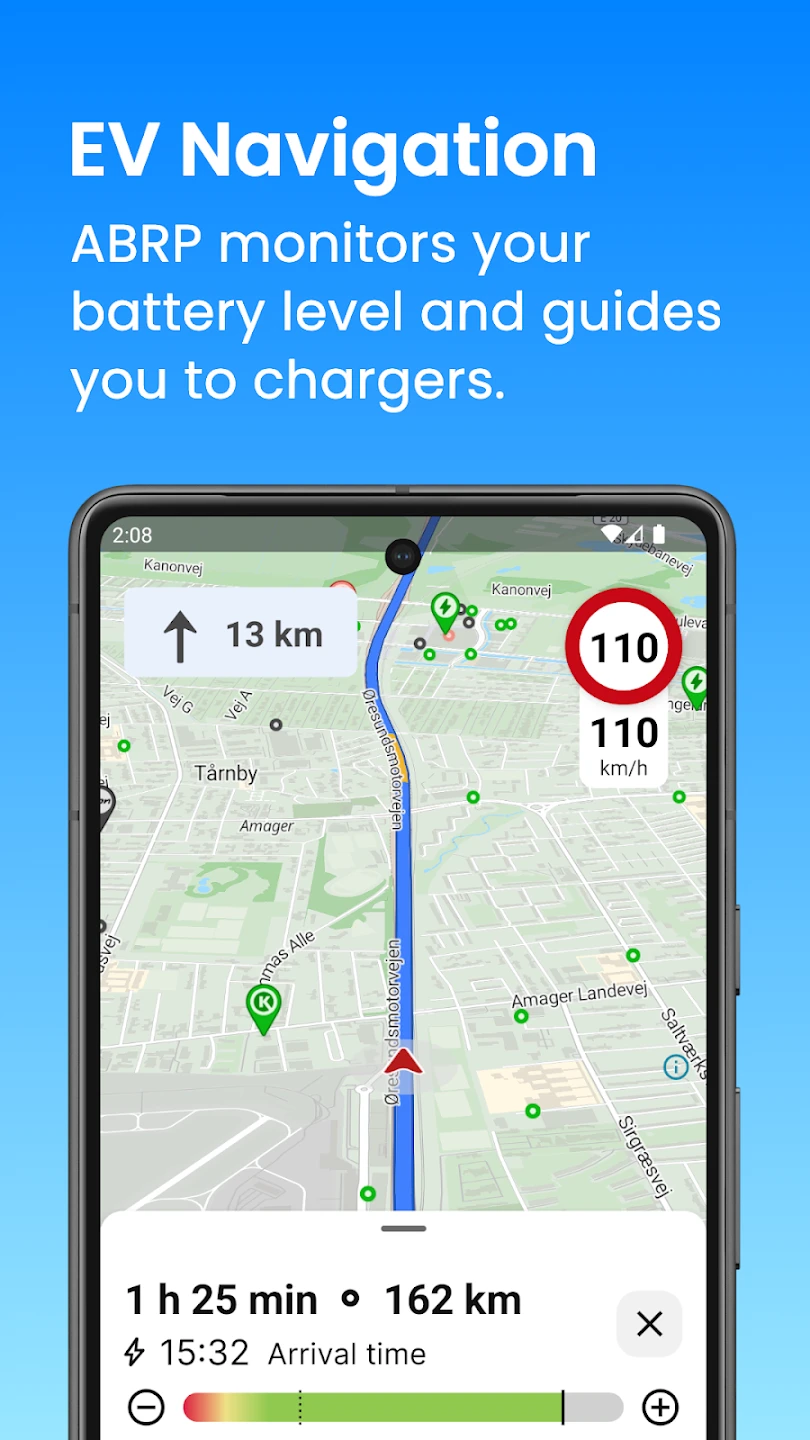 • Comprehensive Charging Infrastructure Integration: ABRP pulls data on a vast network of charging stations globally, displaying locations, connector types (AC/DC, CHAdeMO, CCS, etc.), charging power availability, and user reviews. This helps users identify and navigate towards suitable charging points based on time constraints or preferred amenities, minimizing search time during long journeys.