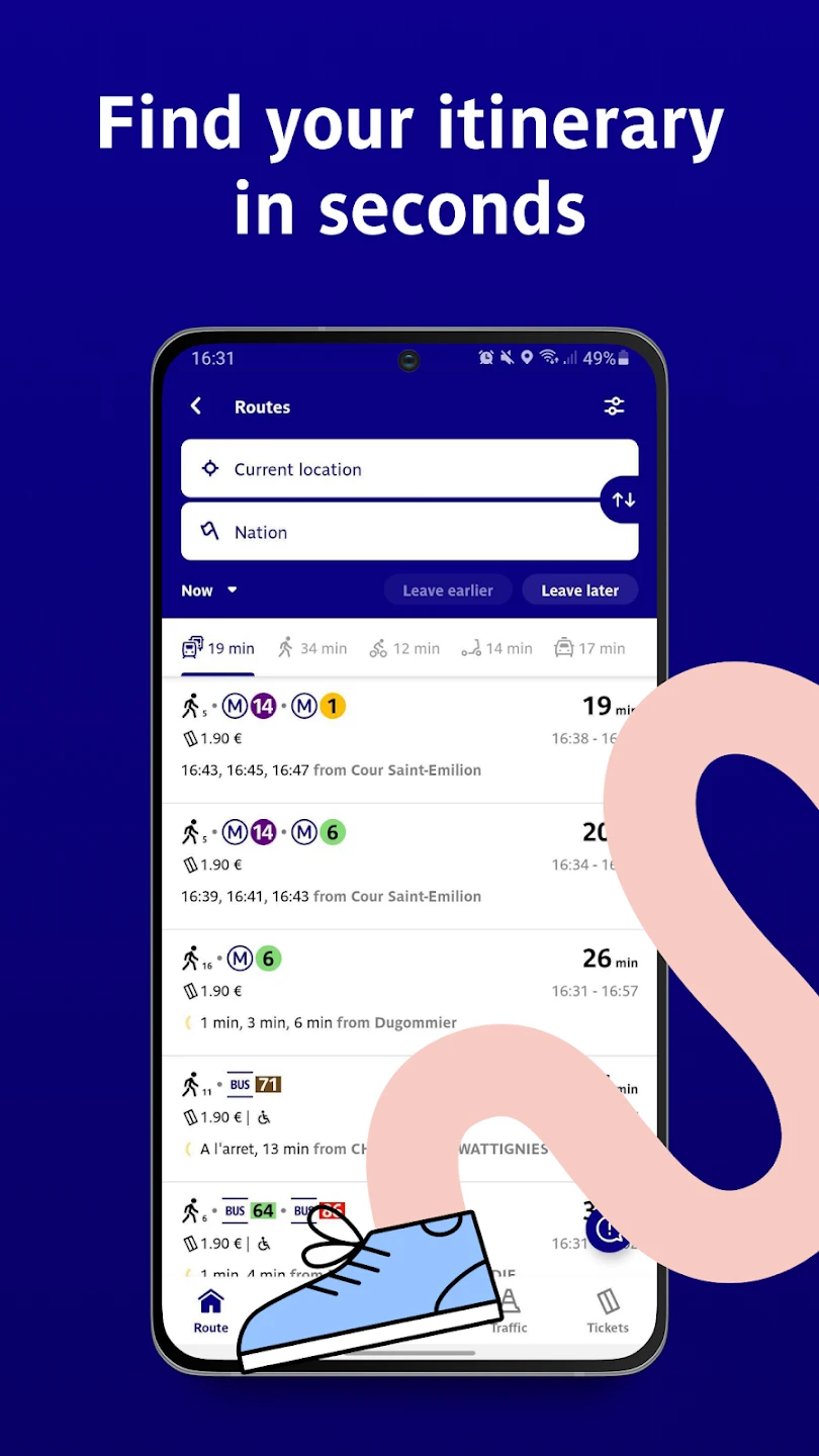- Real-time Journey Planning: Quickly find the best routes and schedules between any two points across the extensive RATP network. This feature saves valuable time by providing instant alternatives and minimizing the guesswork involved in navigating complex transit systems, especially during peak hours or special events.