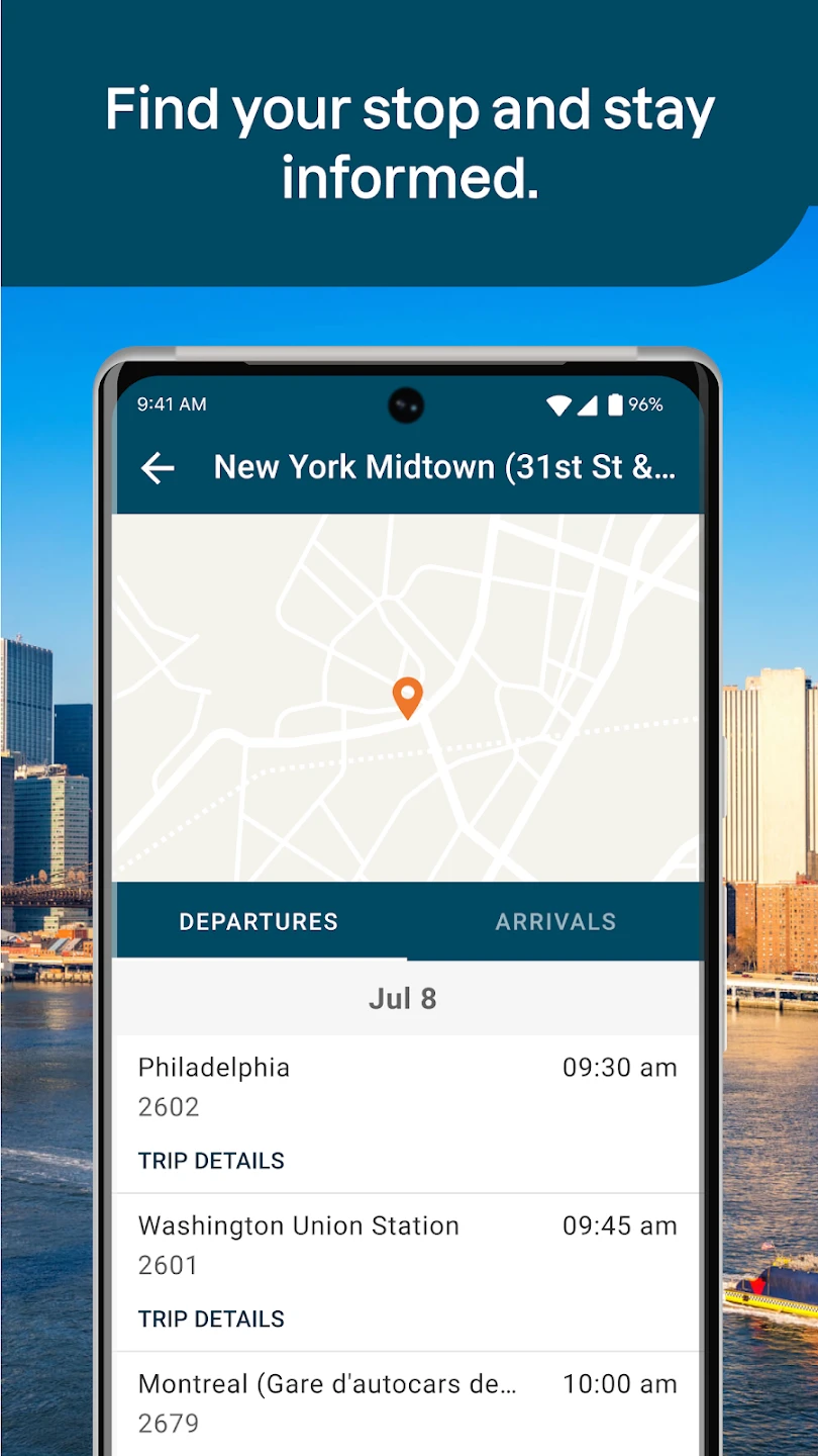 A: You can quickly search for routes from your current location or selected origin point. The app displays available Greyhound and partner buses, their departure times, and arrival times at your destination.