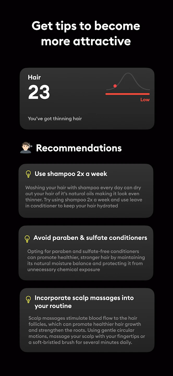 - Personalized Improvement Suggestions: Based on the analysis, the app generates tailored tips addressing specific areas for enhancement, from makeup techniques to hairstyle recommendations or posture adjustments. The system utilizes facial landmark detection and beauty standards data to offer practical advice that’s relevant to your features.