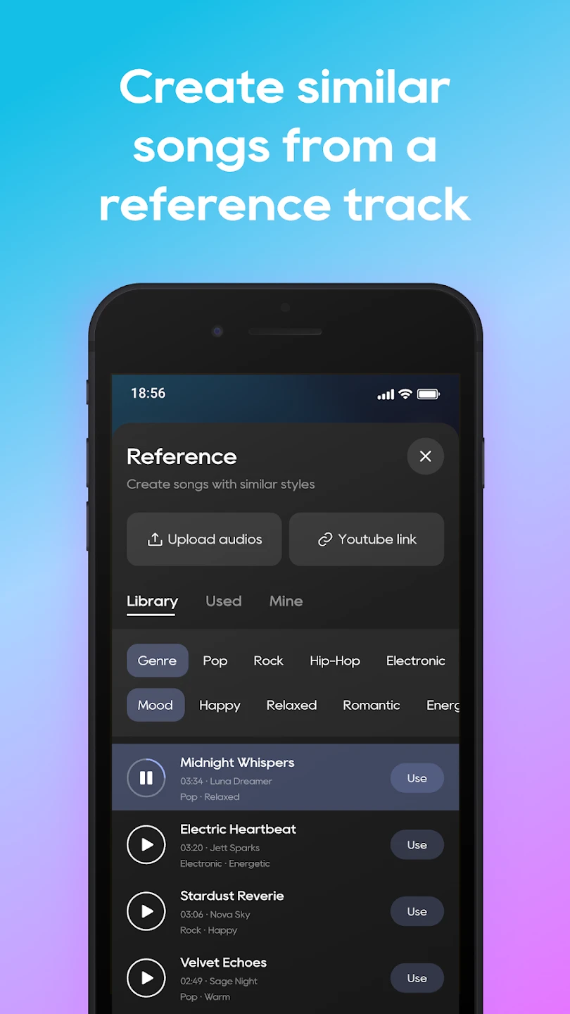 - Extensive Style Library and Parameters: Explore a wide range of musical styles, tempos, moods, and instrumentation options provided by the app. You can refine the generated music using specific technical parameters, ensuring precise control over the output. This feature greatly improves usability by allowing customization without deep technical music knowledge, perfect for tailoring music to fit specific video scenes or emotional beats.