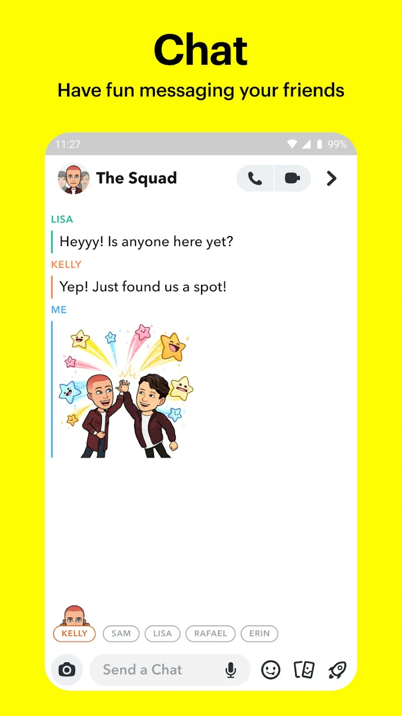 - Group Chat & Bitmoji: Organize conversations with multiple people and personalize avatars for private messaging. This feature streamlines communication for friend groups, allowing members to express themselves visually even when not video calling, while keeping text conversations distinct from media sharing.