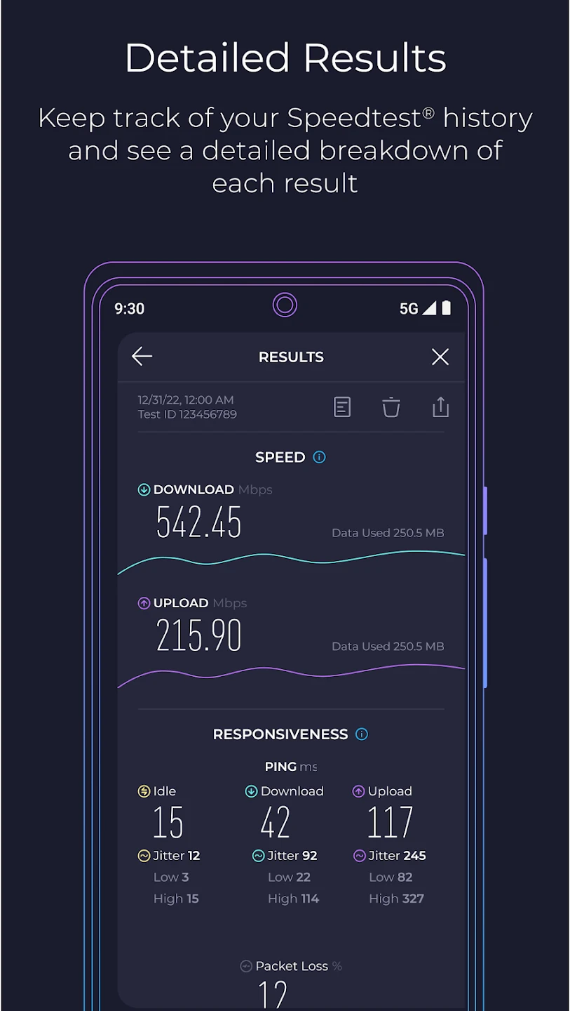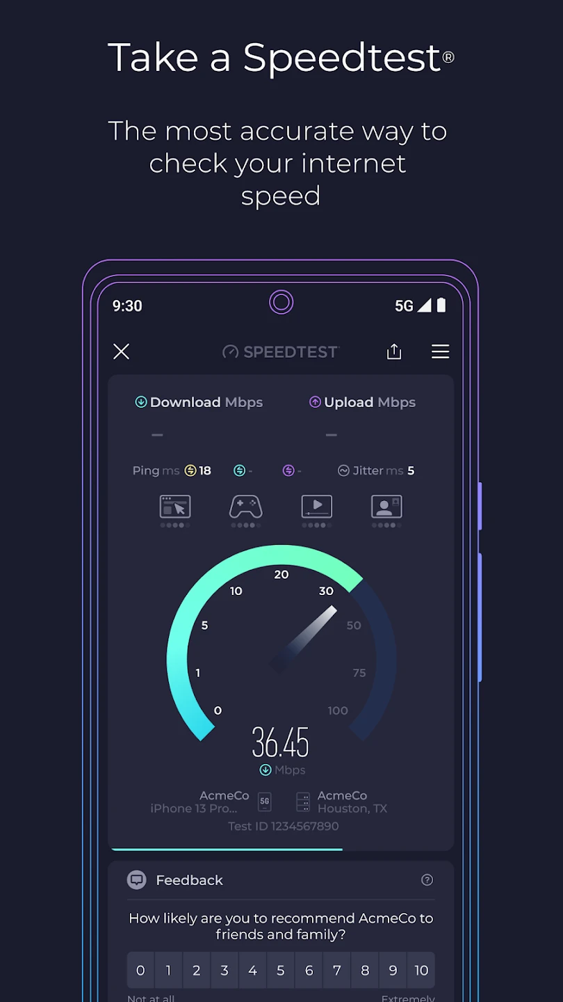 The Speedtest by Ookla app is Ookla’s flagship tool designed for users of all kinds to easily measure their internet connection’s performance directly from their smartphones