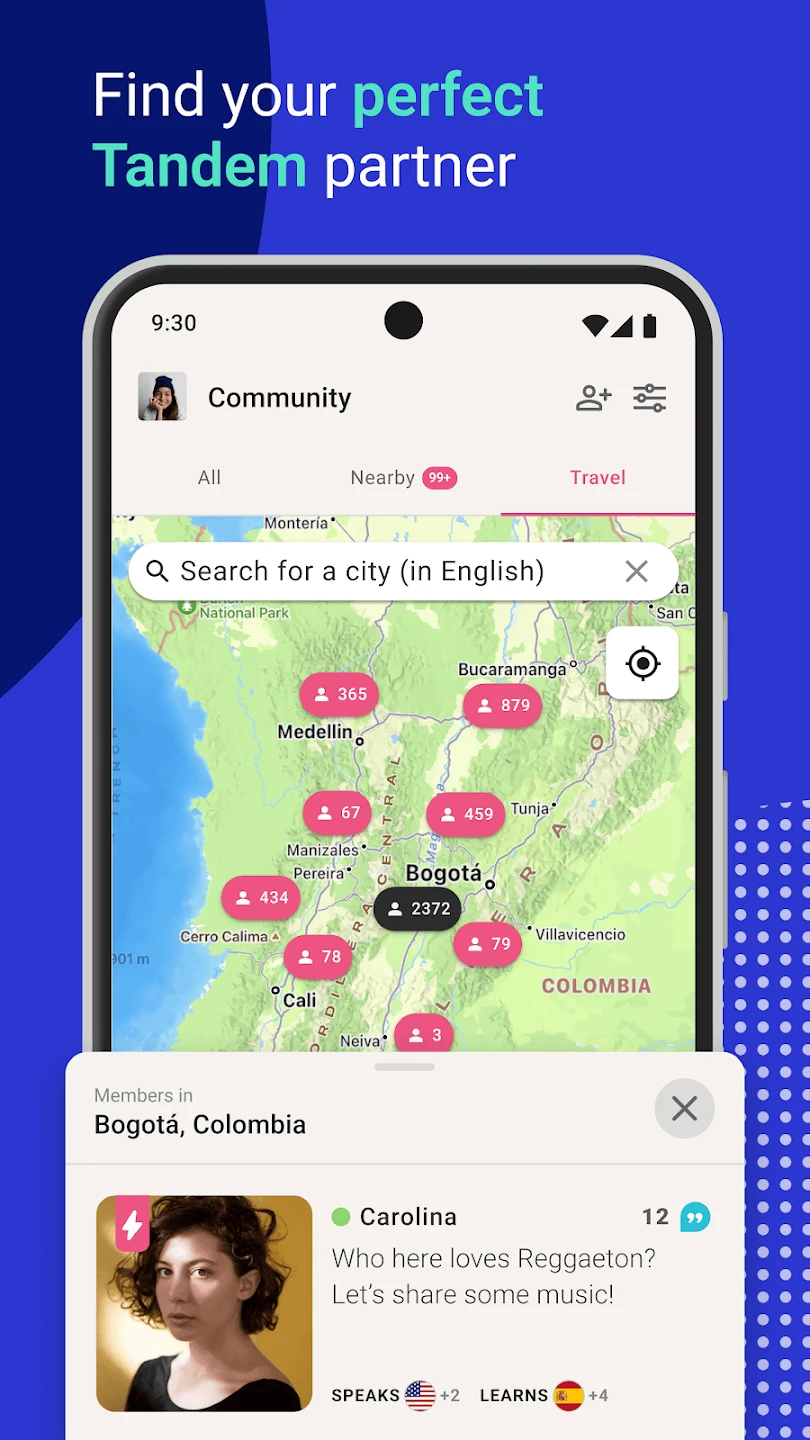 - Language Pair Matching: Tandem utilizes sophisticated algorithms to pair learners with native speakers based on shared language needs and mutual interest within a 15-mile radius. Native speakers benefit from teaching opportunities tailored to their linguistic strengths, while learners receive focused practice in their target language, functioning like a decentralized tutoring system.